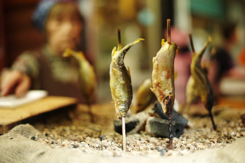 箕面の大滝を眺めながら食べる鮎。美味。